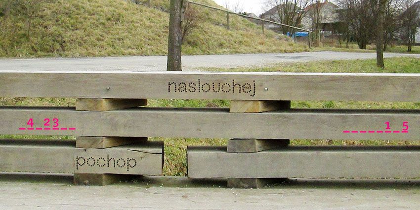 První část hesla rozluštíte podle nápisu na mostku poutníků, který je před vstupem do informačního centra. Použijte správná písmena podle fotografie.